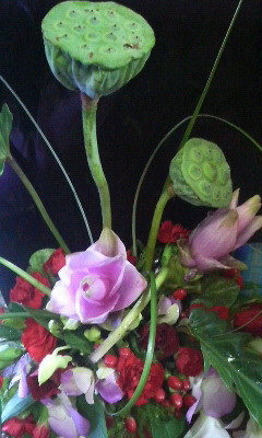 蓮のアレンジ。普段、見慣れない花材は面白い☆